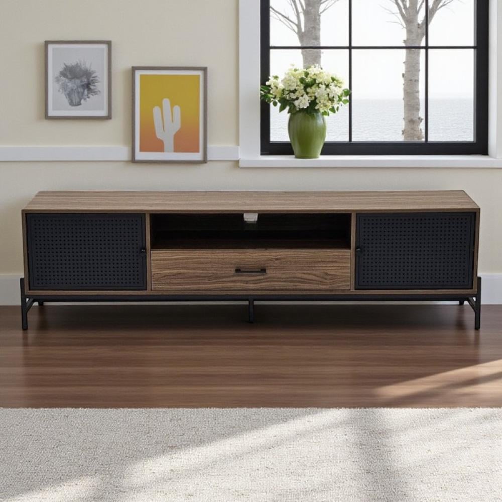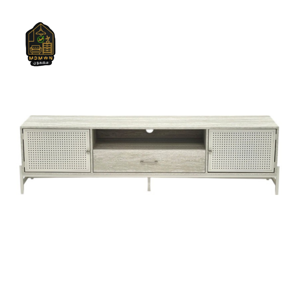 طاولة تلفاز أنيقة مع تصميم عصري وسطح خشبي بلون البيج وأدراج للتخزين. تحتوي على فتحات تهوية في الأبواب الجانبية مما يضفي مظهرًا جذابًا وعملية مثالية للمنازل الحديثة. 🖥️✨