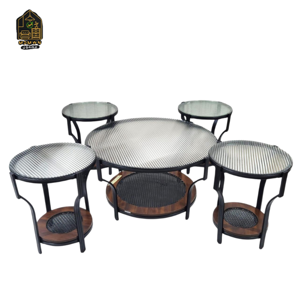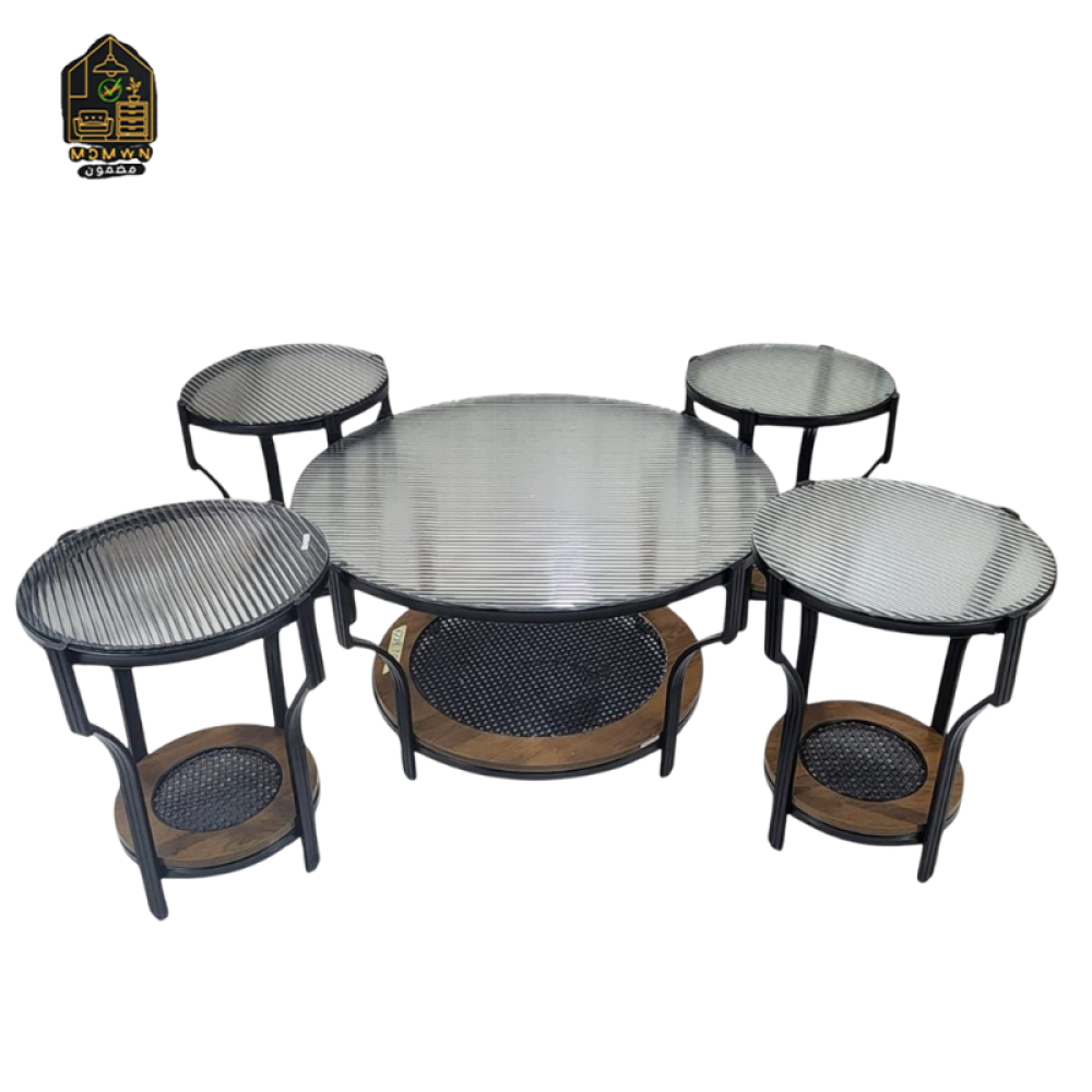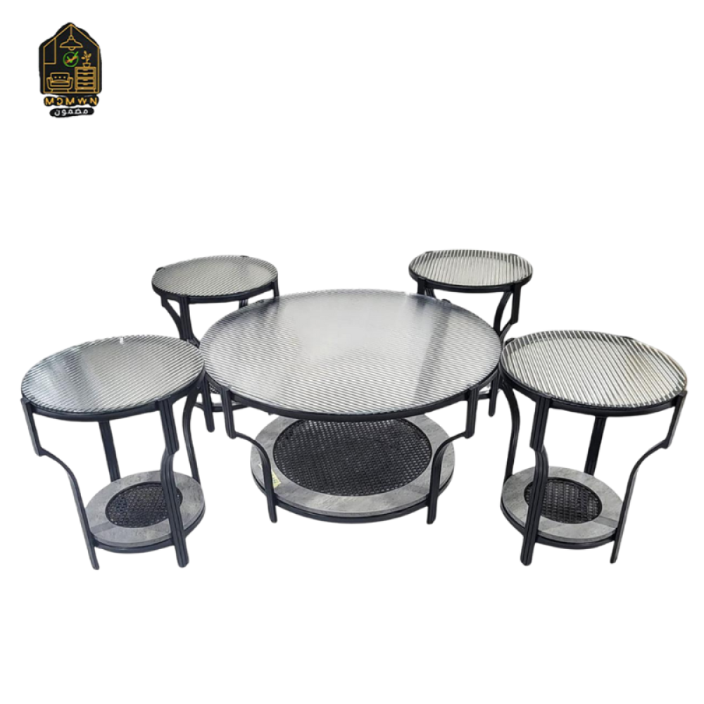الطاولة الكبيرة بسطح شبكي ورف سفلي، وأربع طاولات صغيرة تنسجم حولها بشكل ذكي ومرتب 🔄☕
