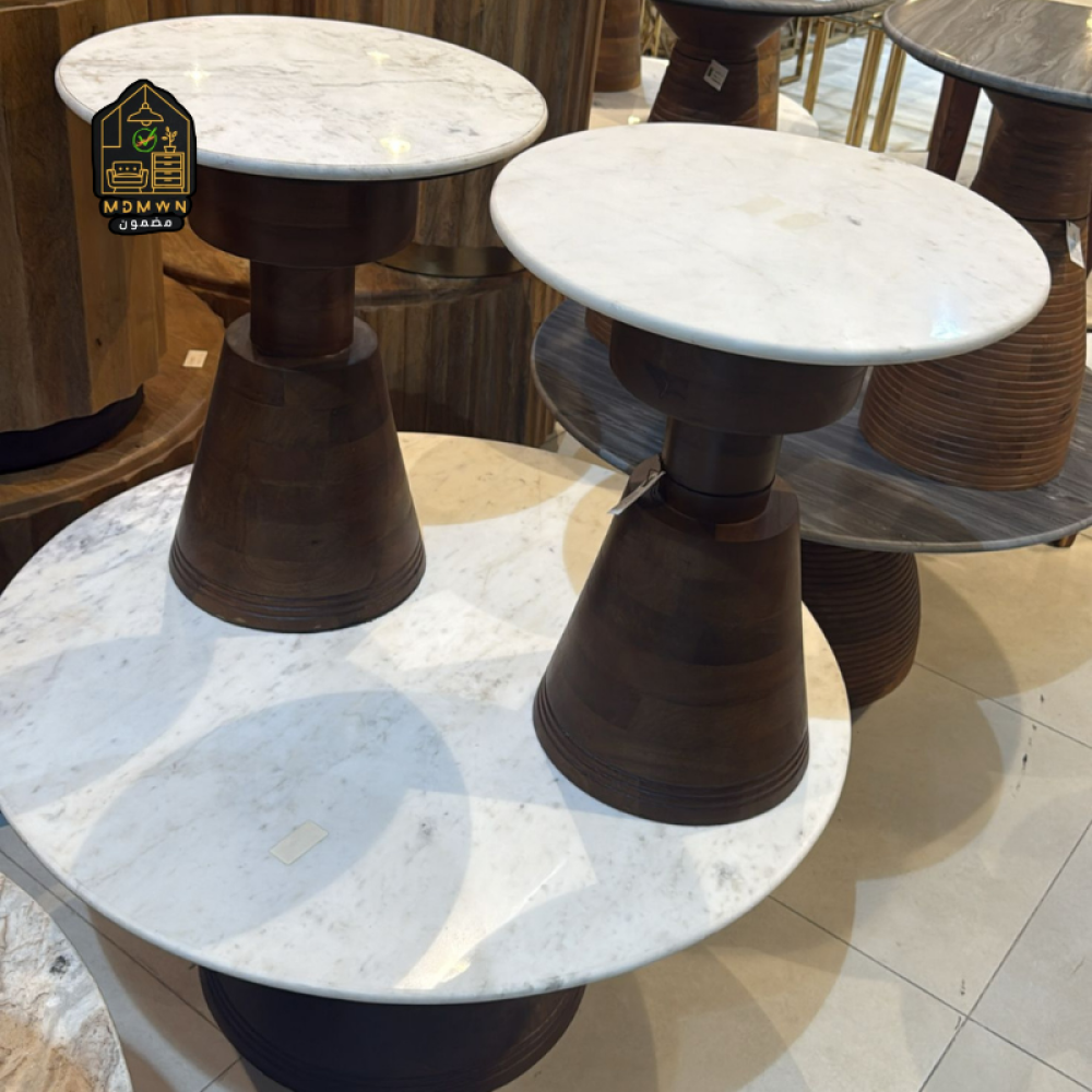 طقم أنيق يجمع بين الرخام الأبيض النقي والقاعدة الخشبية المخروطية الفاخرة 🤍🪵