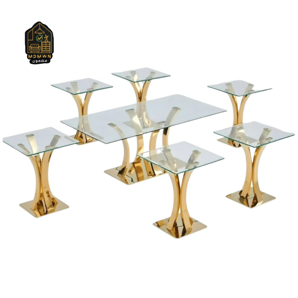 طقم طاولات أنيق بـ7 قطع، قاعدة ذهبية لامعة وسطح زجاجي مربّع ومستطيل يعطي لمسة فريدة ✨