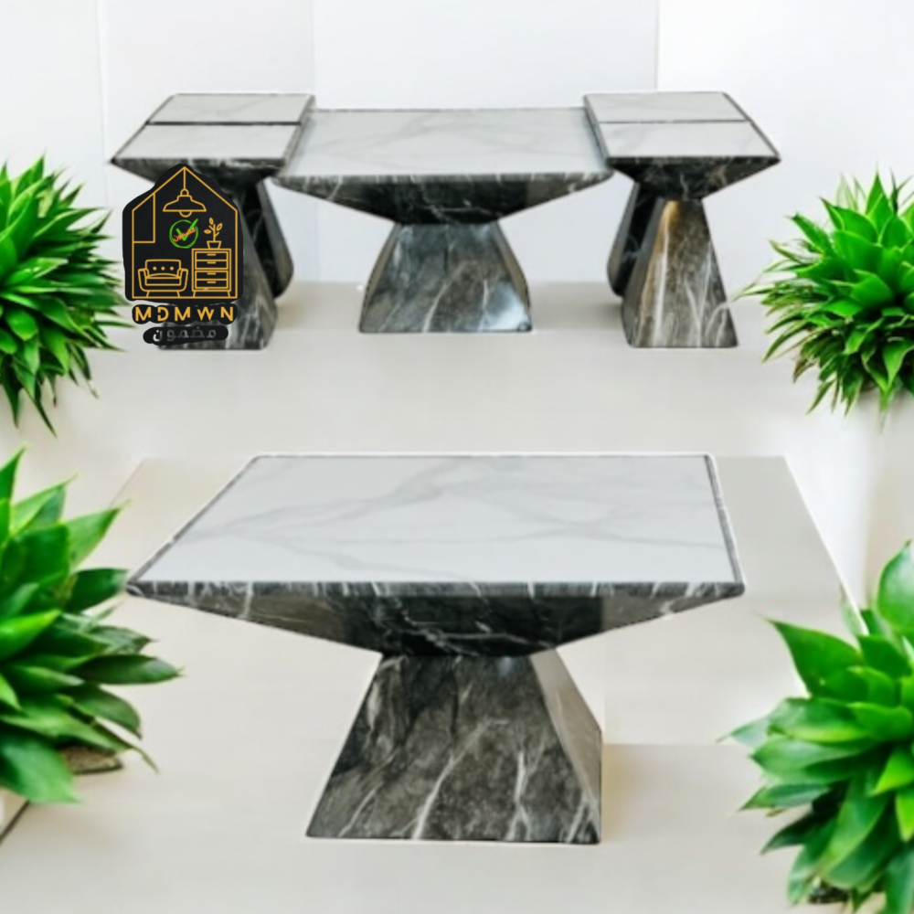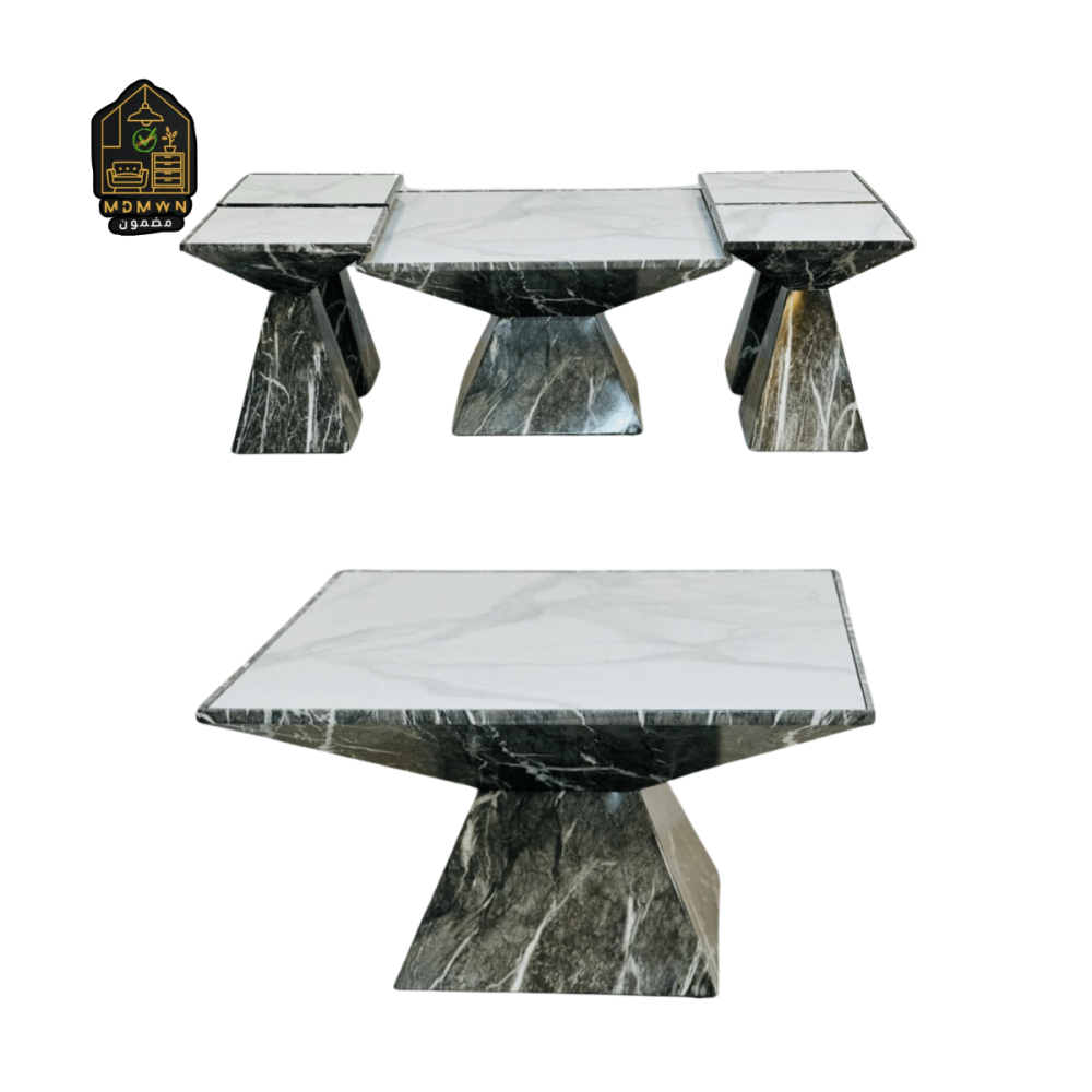 🪄 الطقم يضم طاولة وسط مربعة مع طاولتي خدمة جانبيتين بتصميم متناسق وفاخر يضفي لمسة من الفخامة على غرفة المعيشة أو المجالس الراقية.