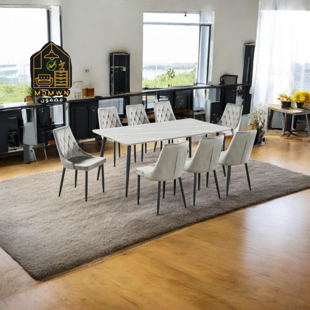 طاولة طعام بديل رخام مع 8 كراسي تعتبر إضافة أنيقة وعملية لأي غرفة طعام. هذه الطاولة مصنوعة من مادة بديلة للرخام التي تمنحها مظهرًا فاخرًا مشابهًا للرخام الطبيعي، مع مزايا مثل سهولة الصيانة والمتانة العالية. يمكن أن تكون الطاولة بتصميم عصري أو كلاسيكي حسب الذوق، مع حواف أنيقة ومستوية.