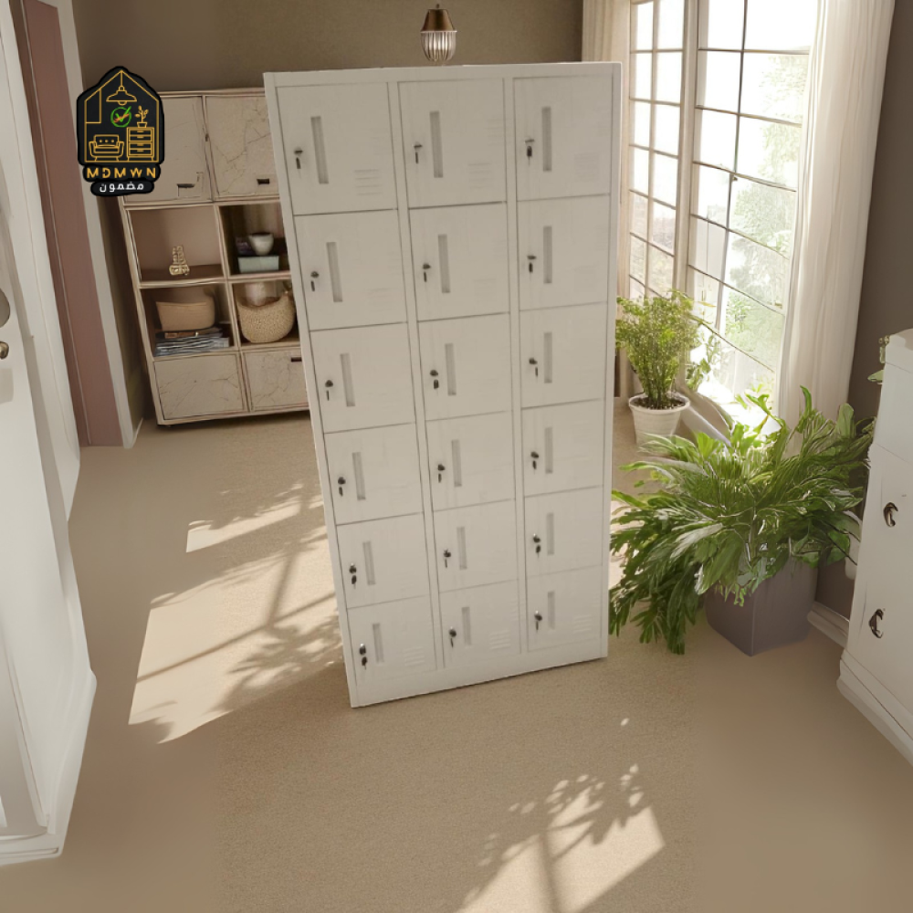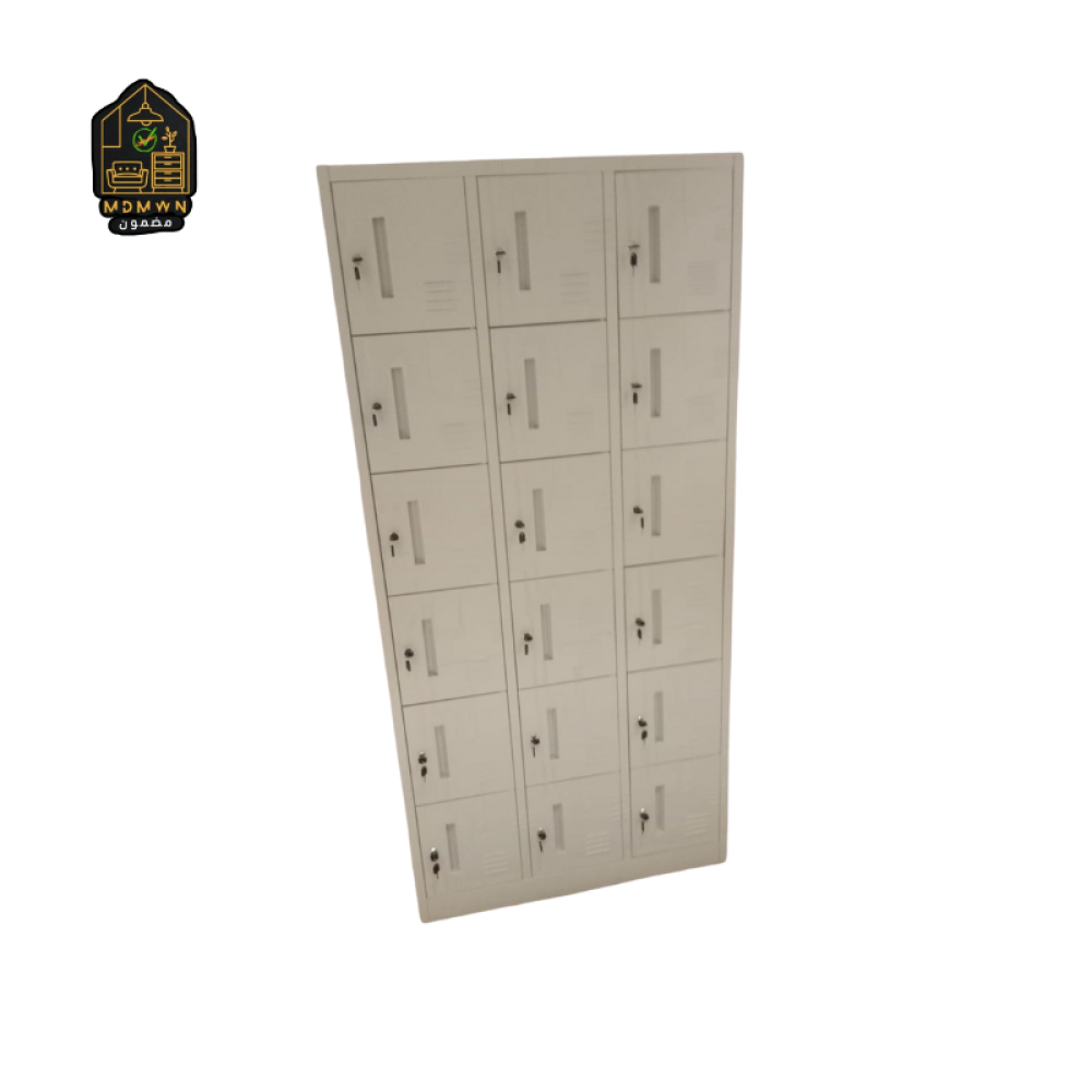 لوكر حديدي 18 باب مستقل 🔒، عملي ومرتب لتخزين الأغراض الشخصية أو ملفات العمل بكل أمان. يجي بتصميم بسيط ولون رمادي رسمي يضيف لمسة مهنية لأي مكان 🧳. مثالي للمدارس، المكاتب، النوادي أو المصانع. فتحات تهوية في كل باب تعزز النظافة وتمنع الروائح.