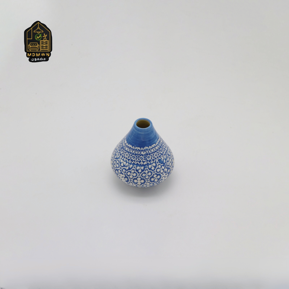 مزهرية بشكل دمعة أنيق، مزيّنة بنقوش بيضاء دقيقة على خلفية زرقاء فاخرة، تضيف دفئًا وأناقة لأي ركن في منزلك أو مكتبك.