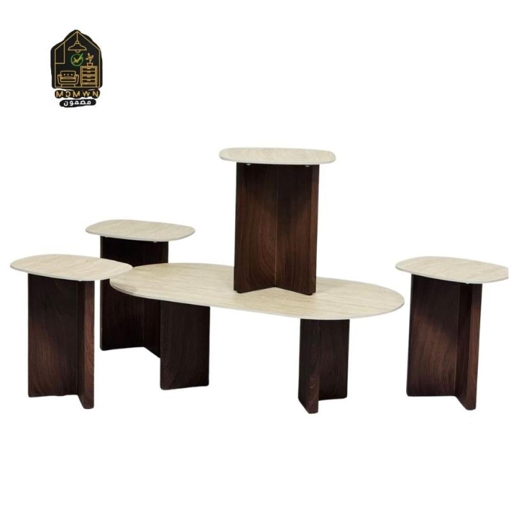 طقم طاولات فاخرة يتكون من طاولة رئيسية كبيرة مع طاولات صغيرة بترتيب مميز، مما يتيح لك تنسيق المساحة بشكل عصري وجميل. يتميز الطقم بتصميمه الحديث الذي يناسب أي غرفة معيشة أو صالون.