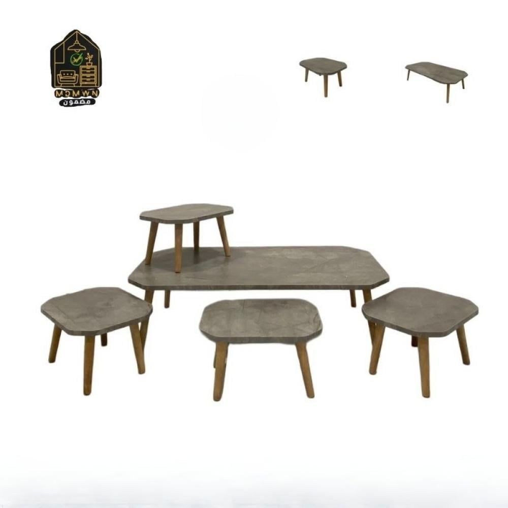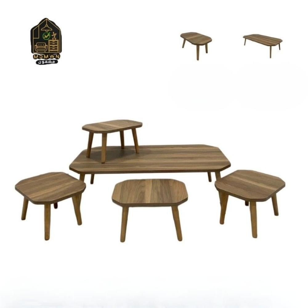 طقم خشبي عصري بتصميم أنيق يجمع بين الفخامة والتقاليد التركية في كل تفاصيله. يتكون الطقم من طاولة رئيسية صغيرة وأربع طاولات صغيرة بأحجام متنوعة، مما يتيح لك تنظيم المساحة بشكل جذاب وعملي.