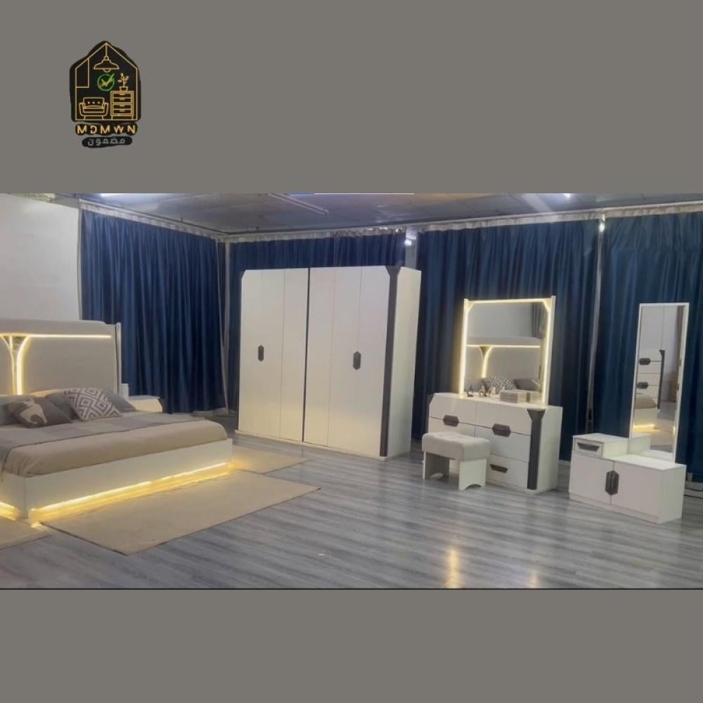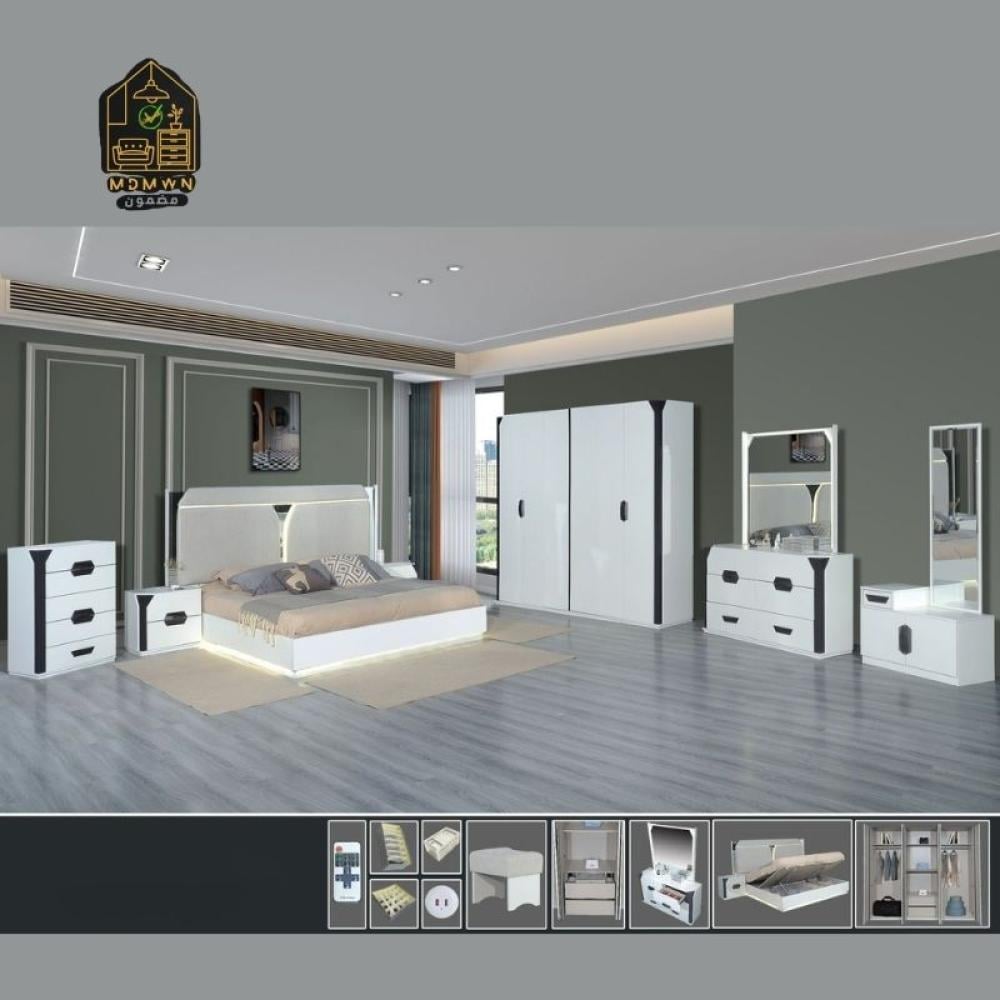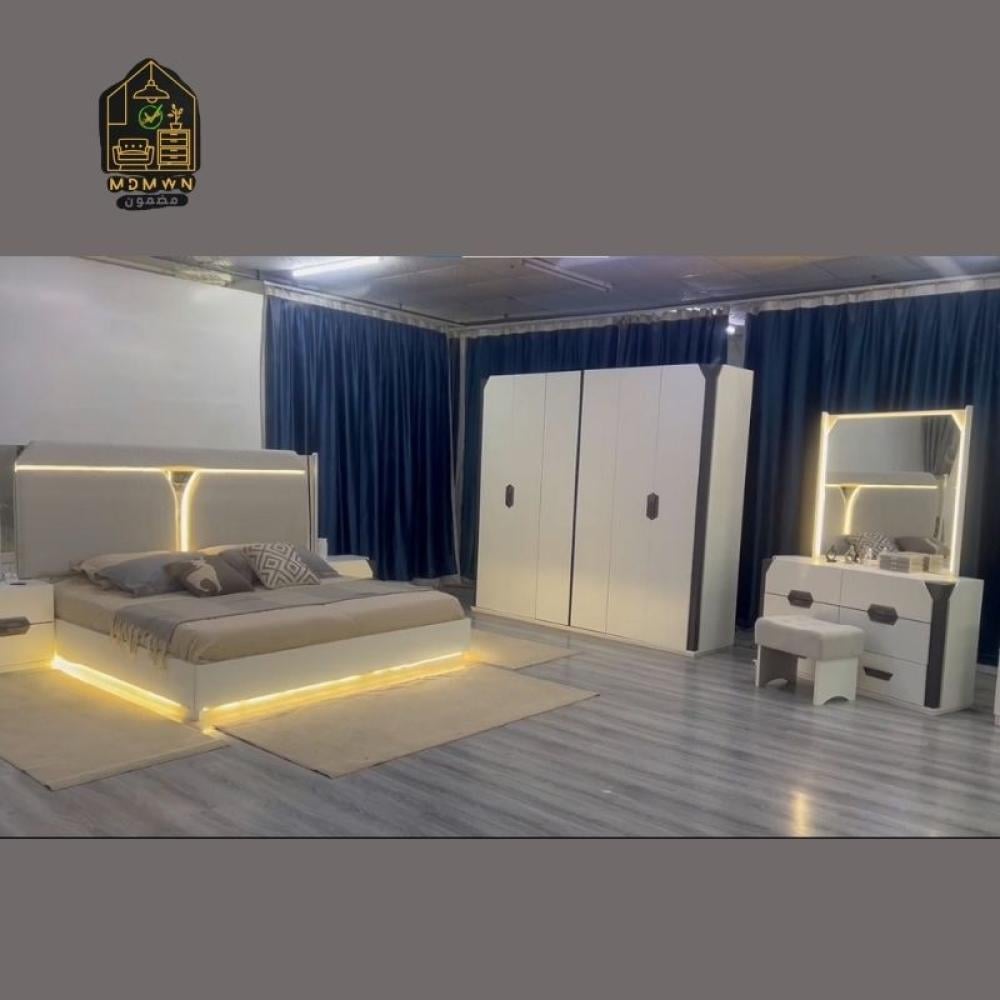 • السرير: يتميز السرير بتصميم حديث مزود بإضاءة LED تحت السرير، مما يضيف جوًا هادئًا وجميلًا عند النوم، مع إمكانية التحكم بالإضاءة عن طريق الريموت.