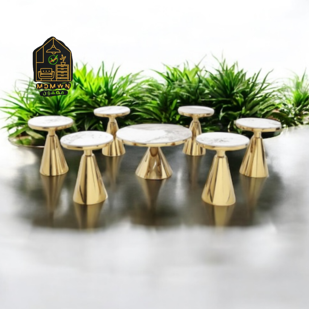 A luxurious tea table set with a modern, coordinated design, consisting of a large center table and six side tables. This set combines the elegance of a polished stainless steel base with the elegance of a ceramic surface with an attractive marble pattern, adding a sophisticated touch to any interior space.