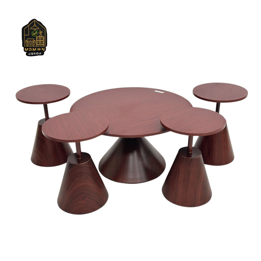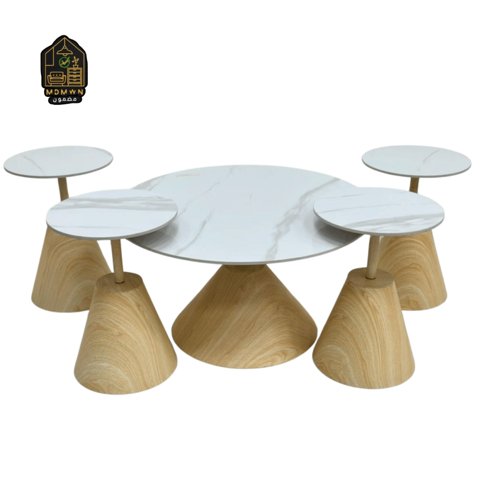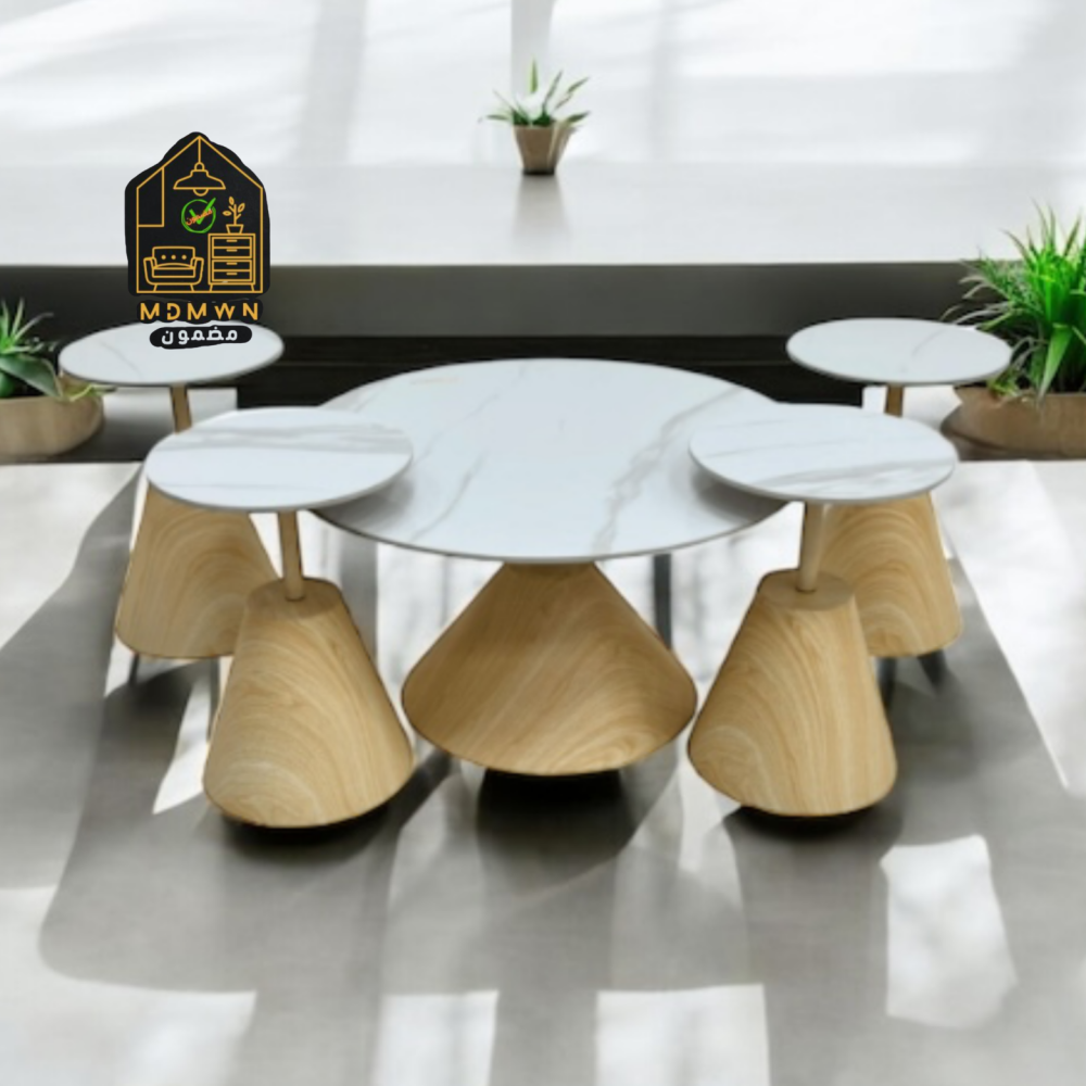 Designed in a modern style, the set consists of a large circular table and four smaller side tables, all resting on conical bases, giving the space an artistic touch and a unique appeal.