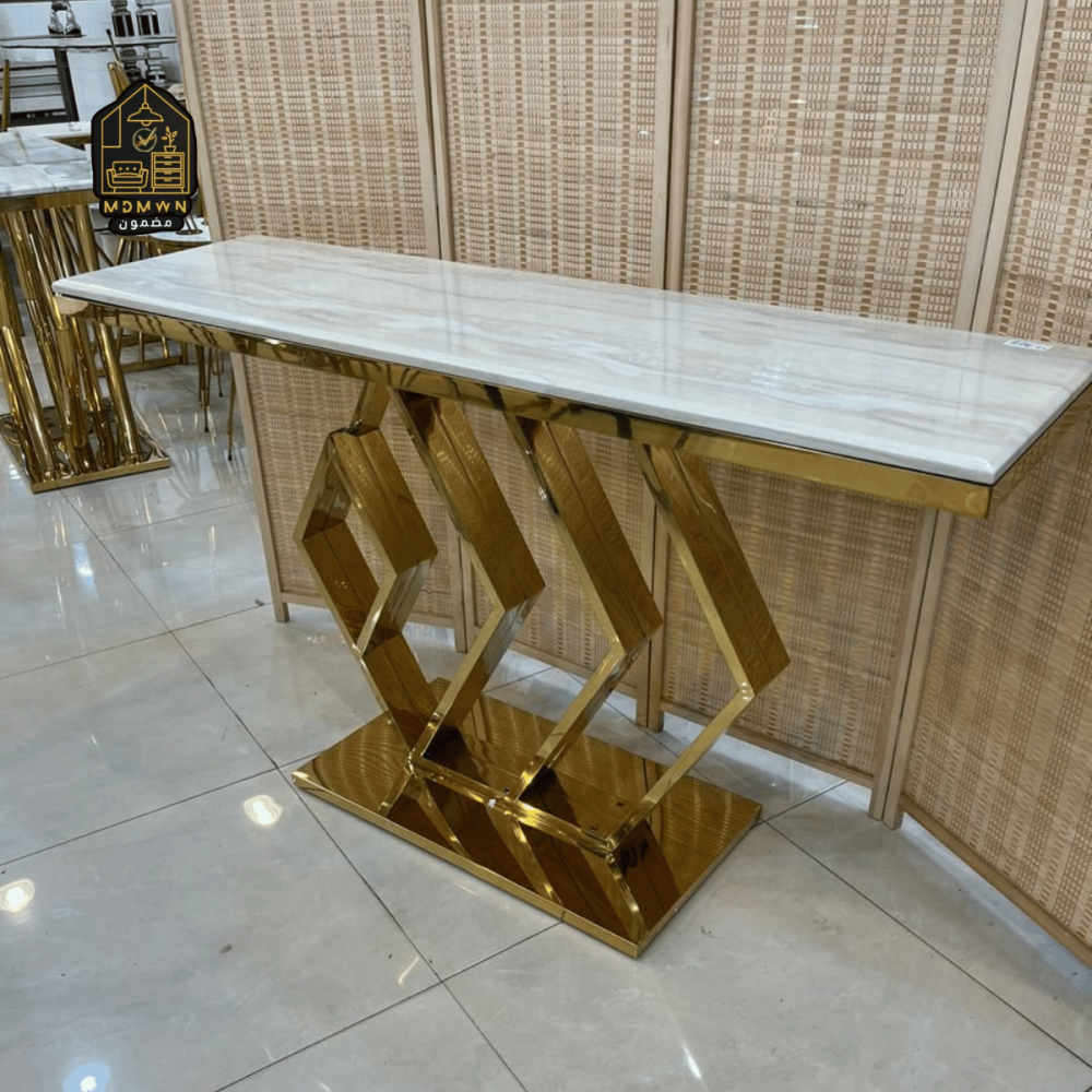 Create a strikingly elegant entrance to your home with this luxurious console table, blending modern art with classic luxury. It features an elegant marble top in a lustrous ivory color, giving it a sophisticated feel. It's supported by a metal base featuring a shiny gold geometric design, adding a unique artistic dimension to your interior decor.