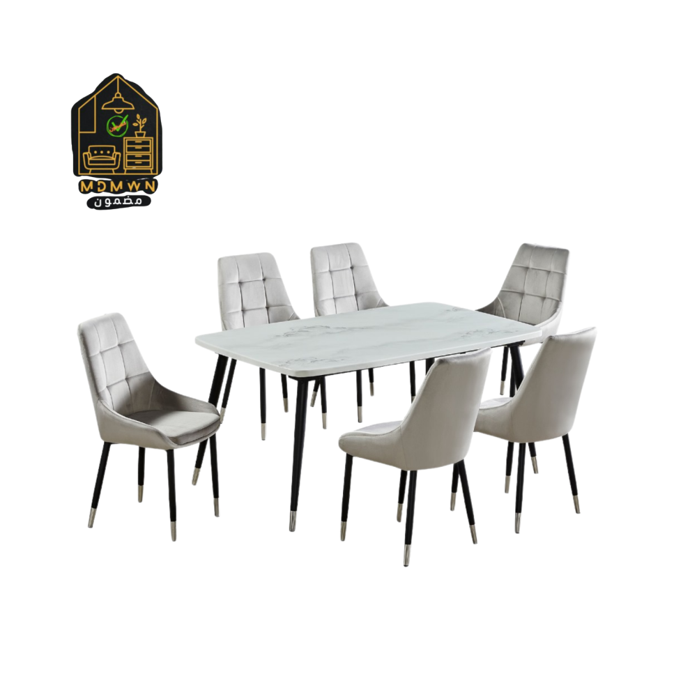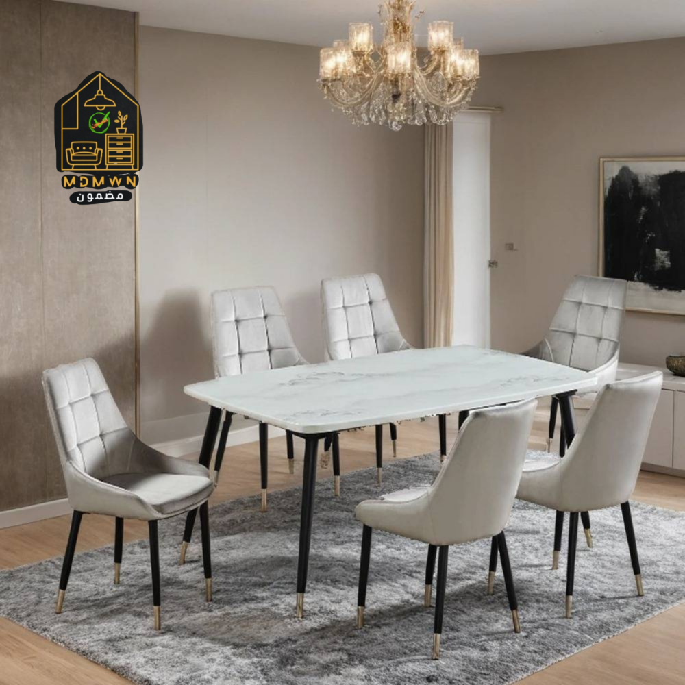 This marble table set with 6 chairs is a luxurious and elegant design that fits in with large spaces and spacious entryways. The set consists of a round or rectangular table made of high-quality natural or engineered marble, with a smooth, durable surface that adds a touch of luxury. The marble features color gradations such as white with gray lines or black with gold accents, giving the set a modern or traditional look, depending on the style.