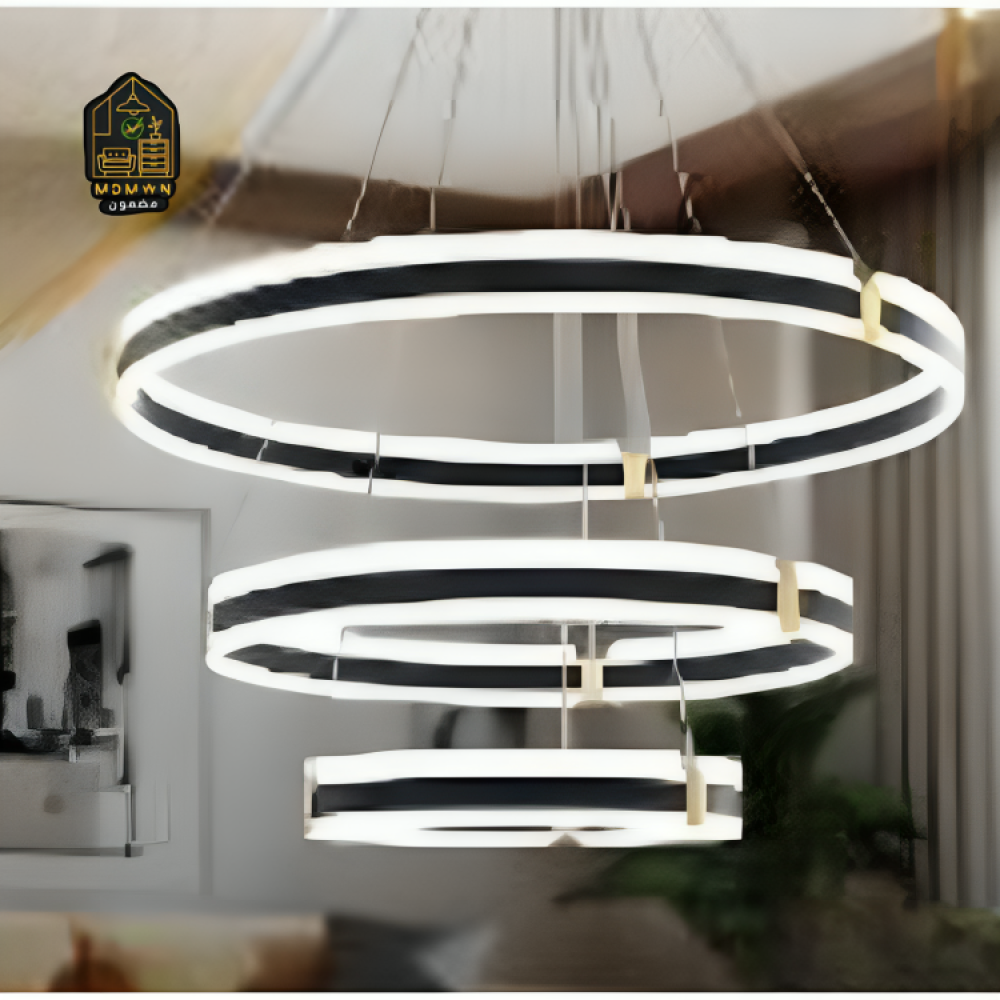 If you're looking for a design that combines boldness and softness, the "Orbits of Light" chandelier is for you 🌀✨! Three black rings with an illuminated frame that resemble space orbits illuminate the space with a bold, modern flair. 👁️💡 It adds an elegant touch to any living room or sitting room, especially for those who love simple decor with a strong personality. 🤍 Its intelligently distributed LED lighting creates a fresh and luxurious atmosphere at the same time.