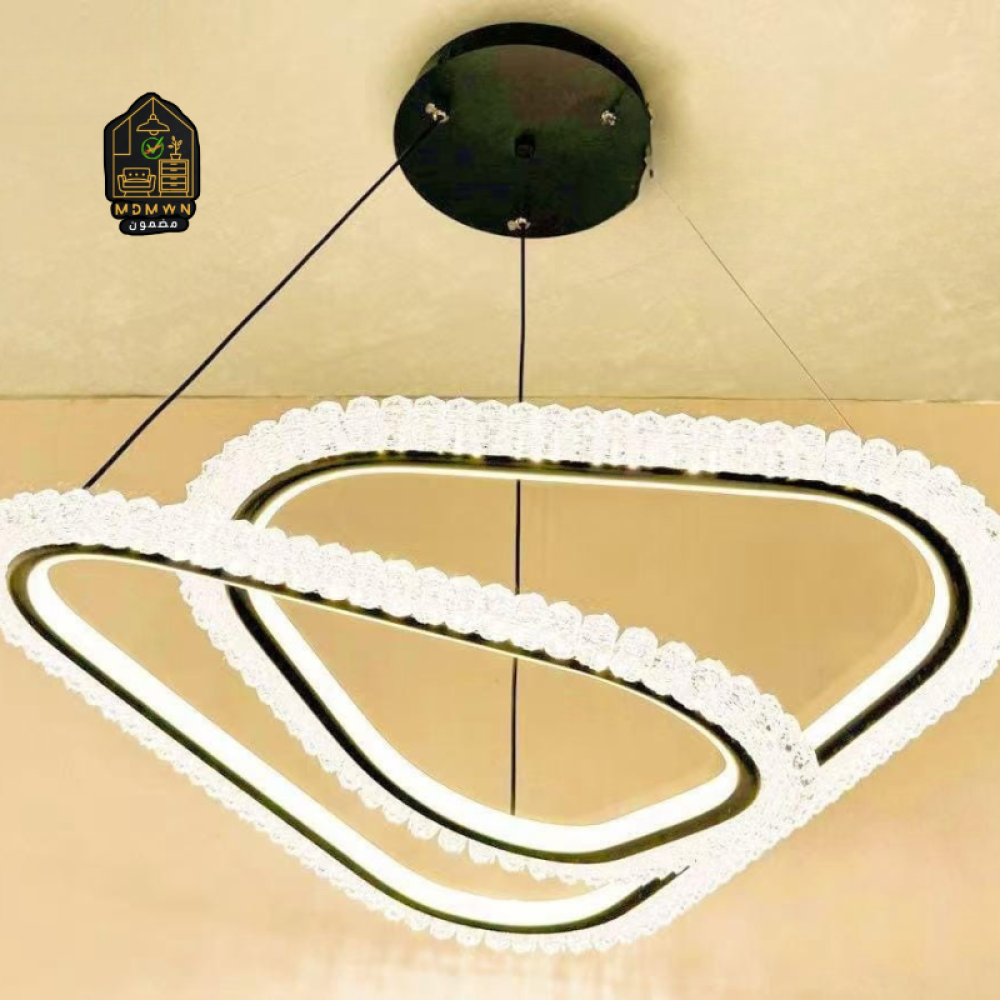 A modern pyramid-shaped chandelier adorns your ceiling with elegance and luxury. The crystals surrounding the rings give off a dazzling shine. ✨ Its LED lighting is elegantly distributed, soothing to the eye and giving the space a luxurious atmosphere. It's suitable for halls, living rooms, and dining rooms and enhances the beauty of the décor. It creates a unique atmosphere, as if you were under the stars hanging above you!